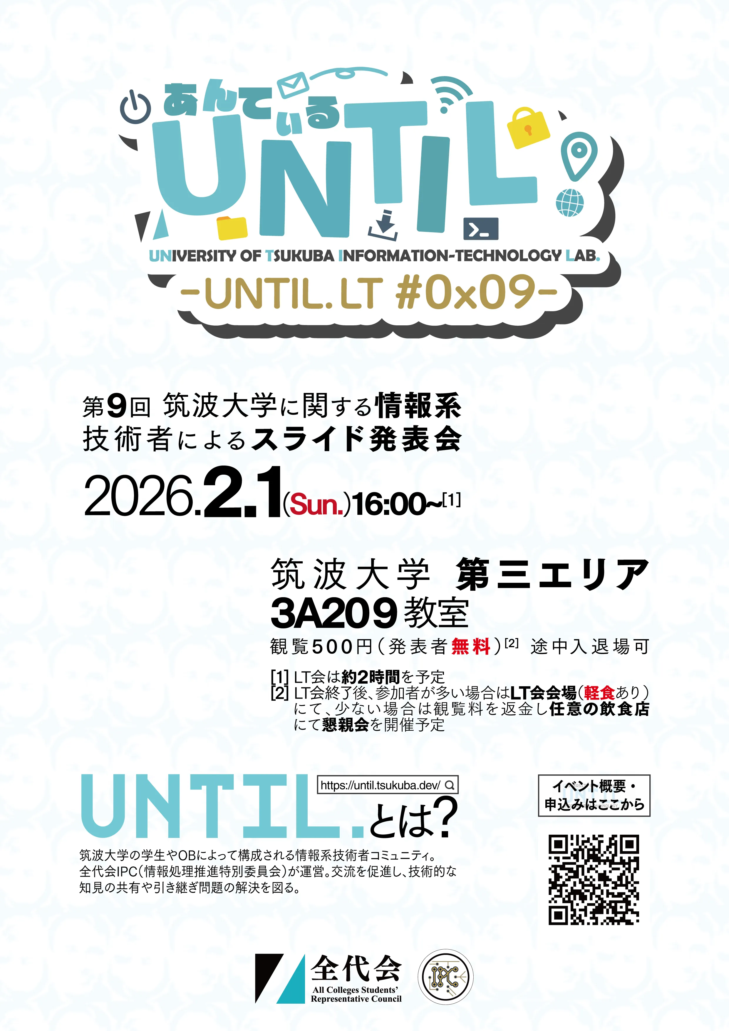 筑波大学に関わる情報技術者による LT 会 「UNTIL. LT」 の第 0x09 回 です。